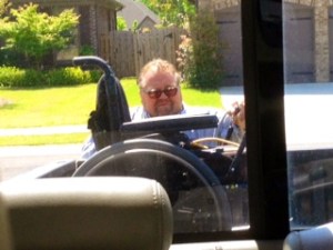 Bud also doesn’t believe in breaking down my wheelchair so it fits conveniently in the truck. He prefers to strap it down in the back, Beverly Hillbillies style. Bud doesn’t give a rip.