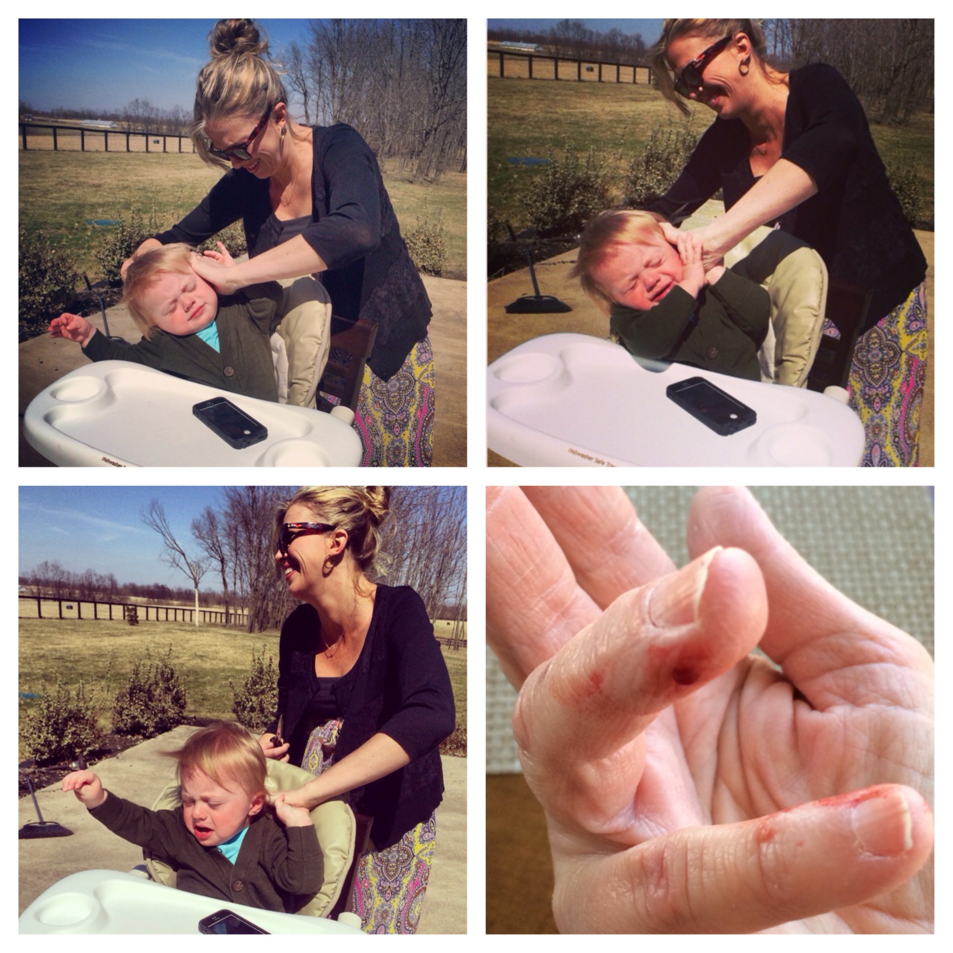 I had no time for precision. I knew at that moment I had to snip  as quickly as I could. Nance tried to hold his hands down. In the line of duty, she suffered a battle wound. Blood eeevrywhere. Luke screaming bloody murder. Did I mention I really wanted to save a golden locket from his first haircut? I mean, doesn’t every mom have one of those? Fat chance.