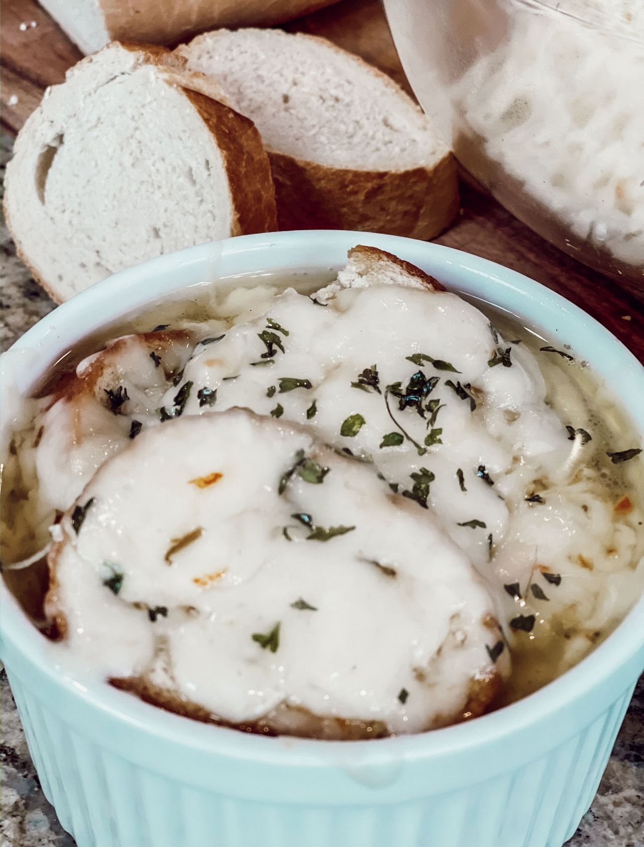 6. Ladle soup in oven safe bowl, top with toasted French Bread and a generous amount of cheese. Let it broil for 1 to 2 minutes.