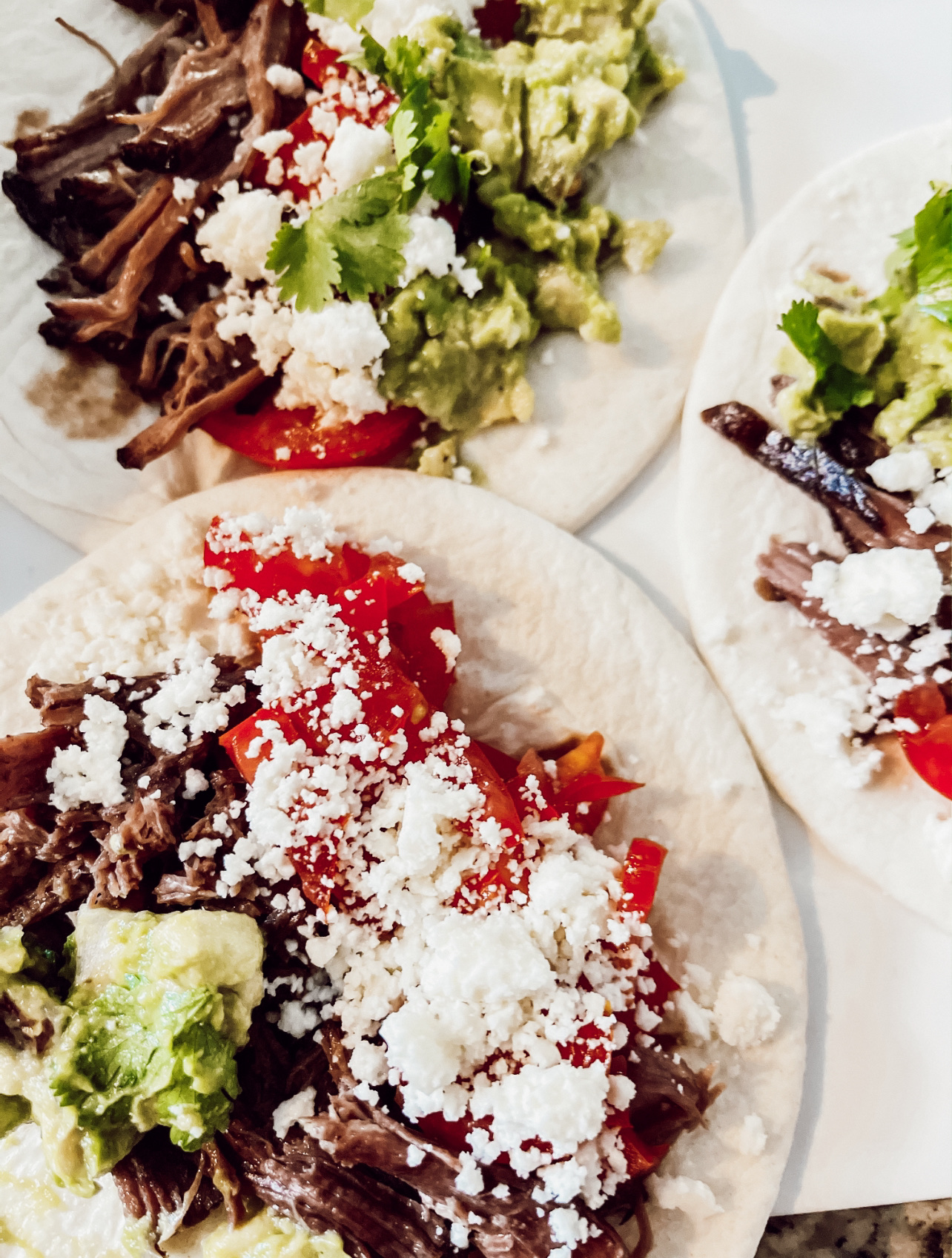 - Spread guacamole on each tostada. Top with beef, cheese, tomatoes, cilantro and other toppings.