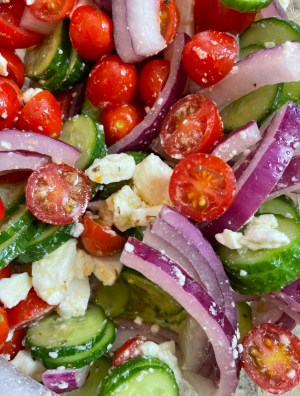 - In a large bowl, combine cucumbers, tomatoes, onions and feta. (add to cooked quinoa or orzo optional)