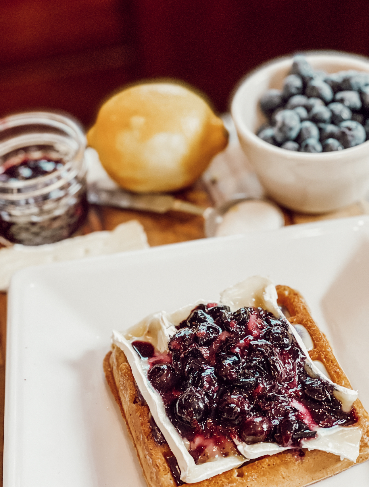4. Add 4-5 slices of brie cheese on top followed by a generous scoop of the blueberry compote.