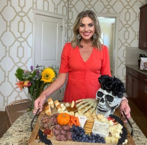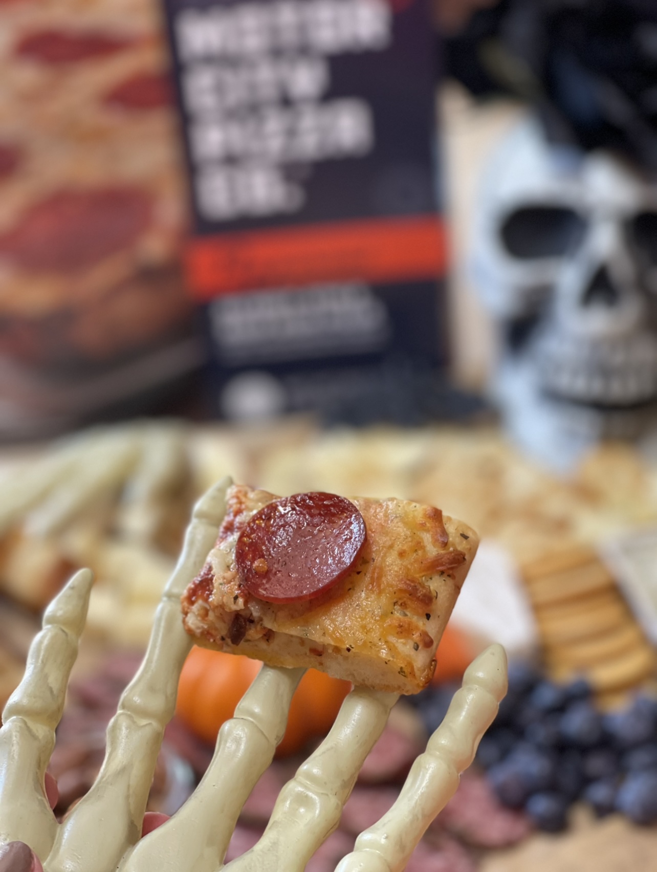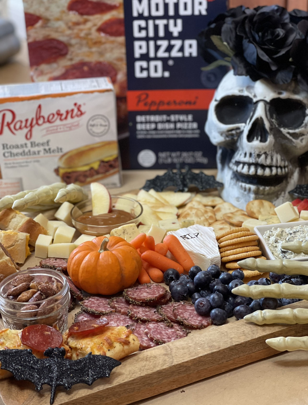 My Spooky Scary Skeleton charcuterie board was really simple! I purchased the skeleton head and hands from The Dollar Store, along with the black roses. I cut a hole in the top of the skeleton head to put the roses in.