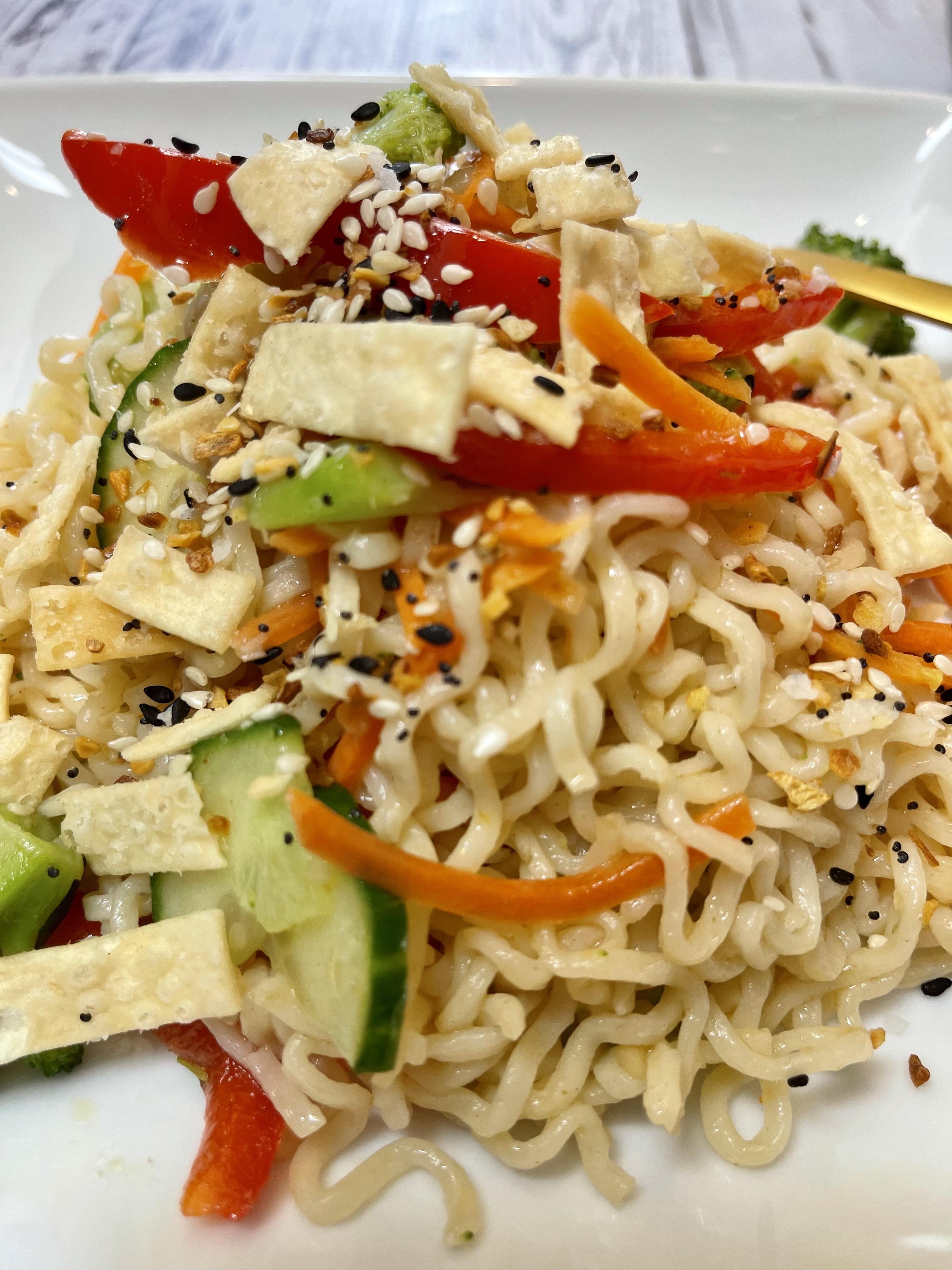 - Add ramen to large pan with vegetables and add the sesame ginger dressing, mix and cook for additional 2-3 minutes