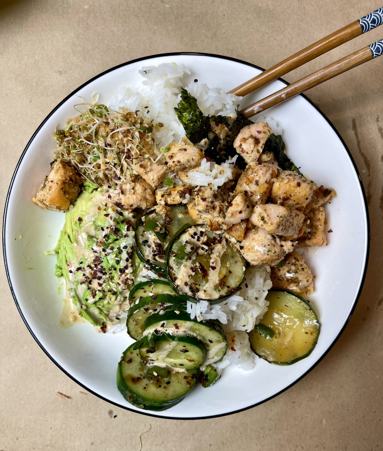- Now you’re ready to assemble! Divide rice among 2 bowls and top with sprout/panko slaw, salmon, avocado and cucumbers. Sprinkle with crush seaweed and toasted sesame seeds or more Japanese inspired Sesame Seaweed Blend Lastly drizzle with the spicy mayo. Serve warm!