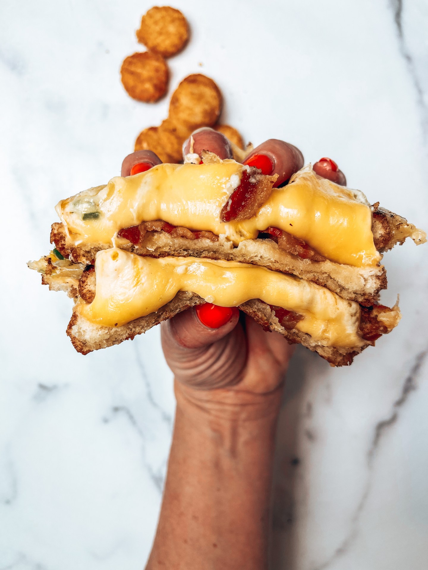 This sandwich is a rich and cheesy twist on a childhood classic, with a savory crunch of bacon. This sandwich takes no time whatsoever to put together. Make this for yourself this week or try it out on the entire family. Modify where needed, as not all kids care for every ingredient listed. You really could choose whatever blend of cheese slices you like or have on hand. I had white cheddar and gouda, but you could easily use American and provolone, or even pepper jack for a kick!