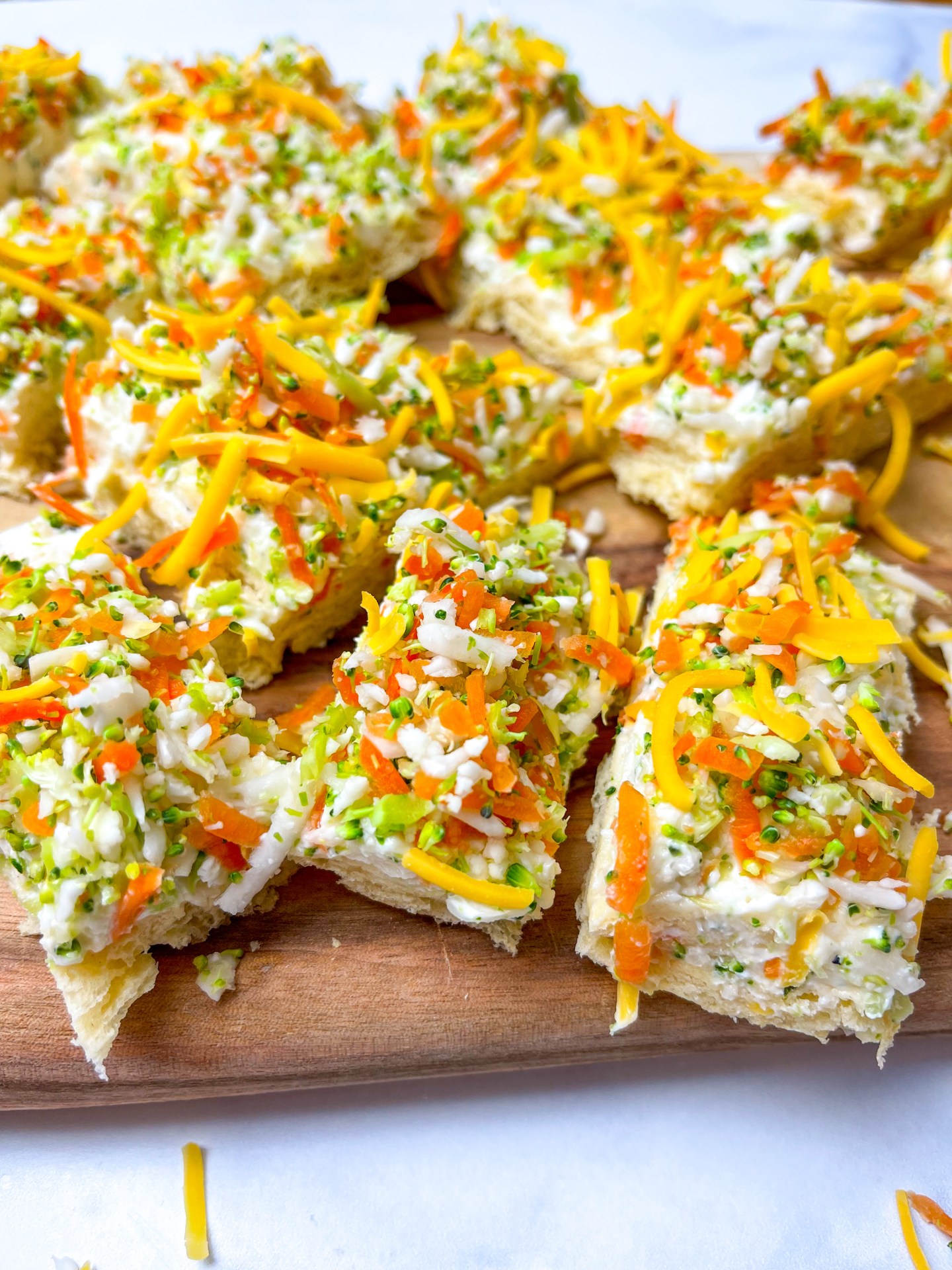 - Layer dough with cream cheese mix, then shredded vegetables and top with cheddar cheese