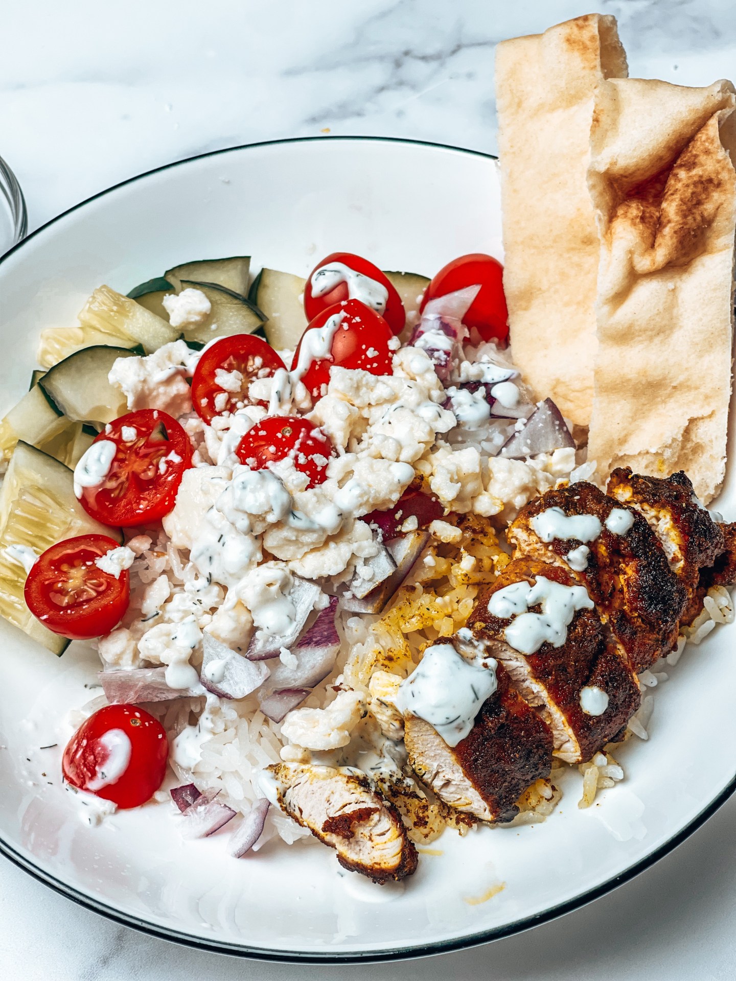 - Add rice or quinoa, chicken and vegetables and drizzle with tzatziki sauce and lemon juice