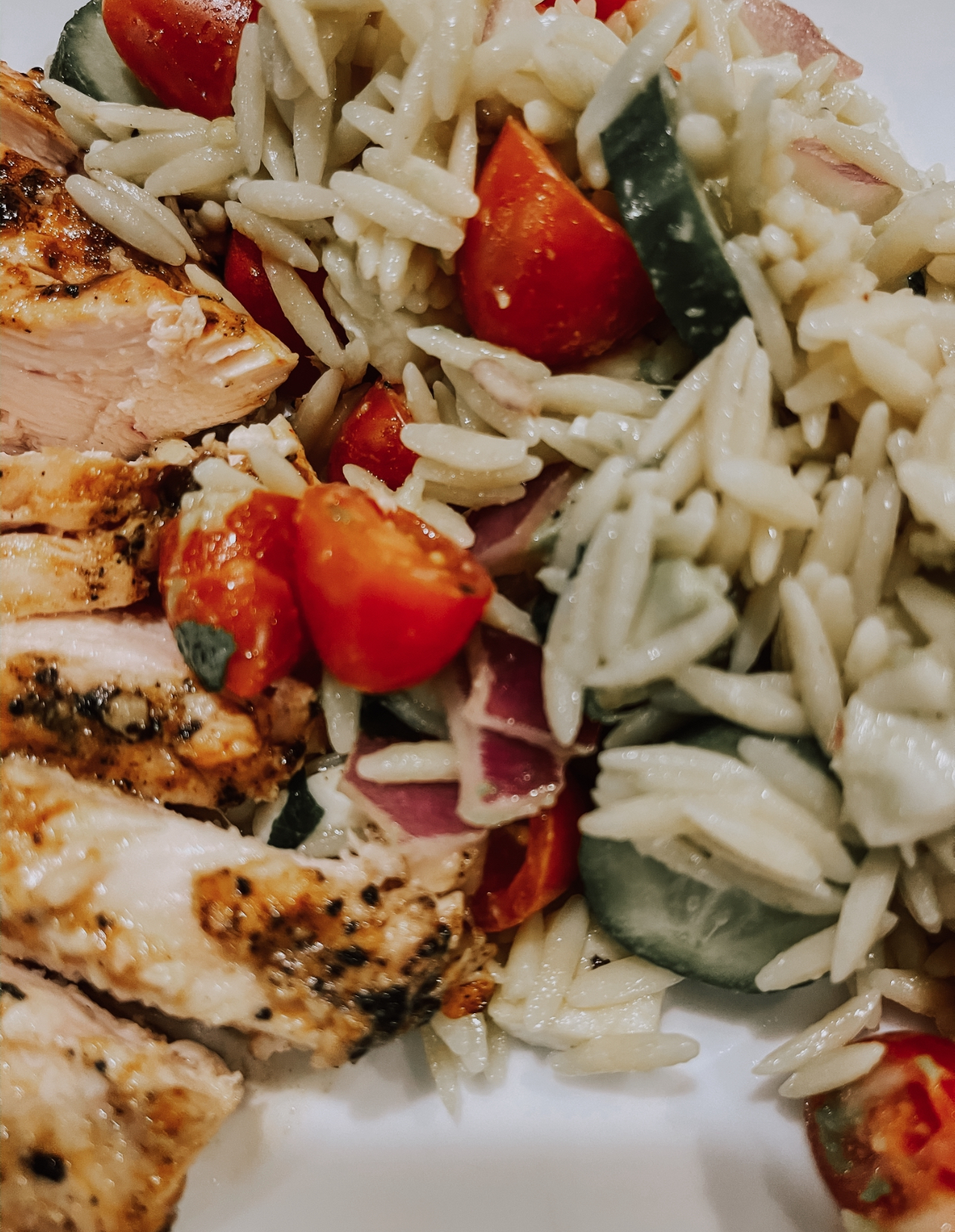 Delicious Honey Chipotle Chicken and Mediterranean Orzo Salad dinner recipe. Perfect for your next cookout!